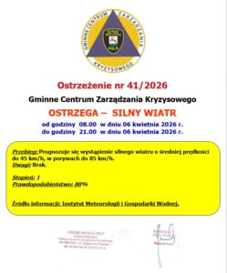 Ostrzeżenie nr 41/2026 Gminne Centrum Zarządzania Kryzysowego OSTRZEGA – SILNY WIATR od godziny 08.00 w dniu 06 kwietnia 2026 r ...