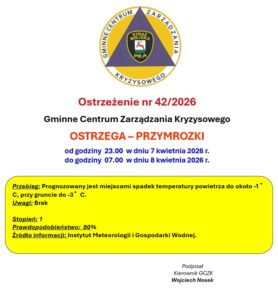 Ostrzeżenie nr 42/2026 Gminne Centrum Zarządzania Kryzysowego OSTRZEGA – PRZYMROZKI od godziny 23.00 w dniu 7 kwietnia 2026 r. do ...