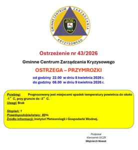 Ostrzeżenie nr 43/2026 Gminne Centrum Zarządzania Kryzysowego OSTRZEGA – PRZYMROZKI od godziny 22.00 w dniu 8 kwietnia 2026 r. do ...