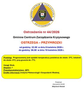 Ostrzeżenie nr 44/2026 Gminne Centrum Zarządzania Kryzysowego OSTRZEGA – PRZYMROZKI od godziny 22.00 w dniu 9 kwietnia 2026 r. do ...