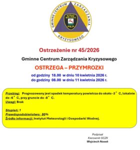 Ostrzeżenie nr 45/2026 Gminne Centrum Zarządzania Kryzysowego OSTRZEGA – PRZYMROZKI od godziny 18.00 w dniu 10 kwietnia 2026 r. do ...